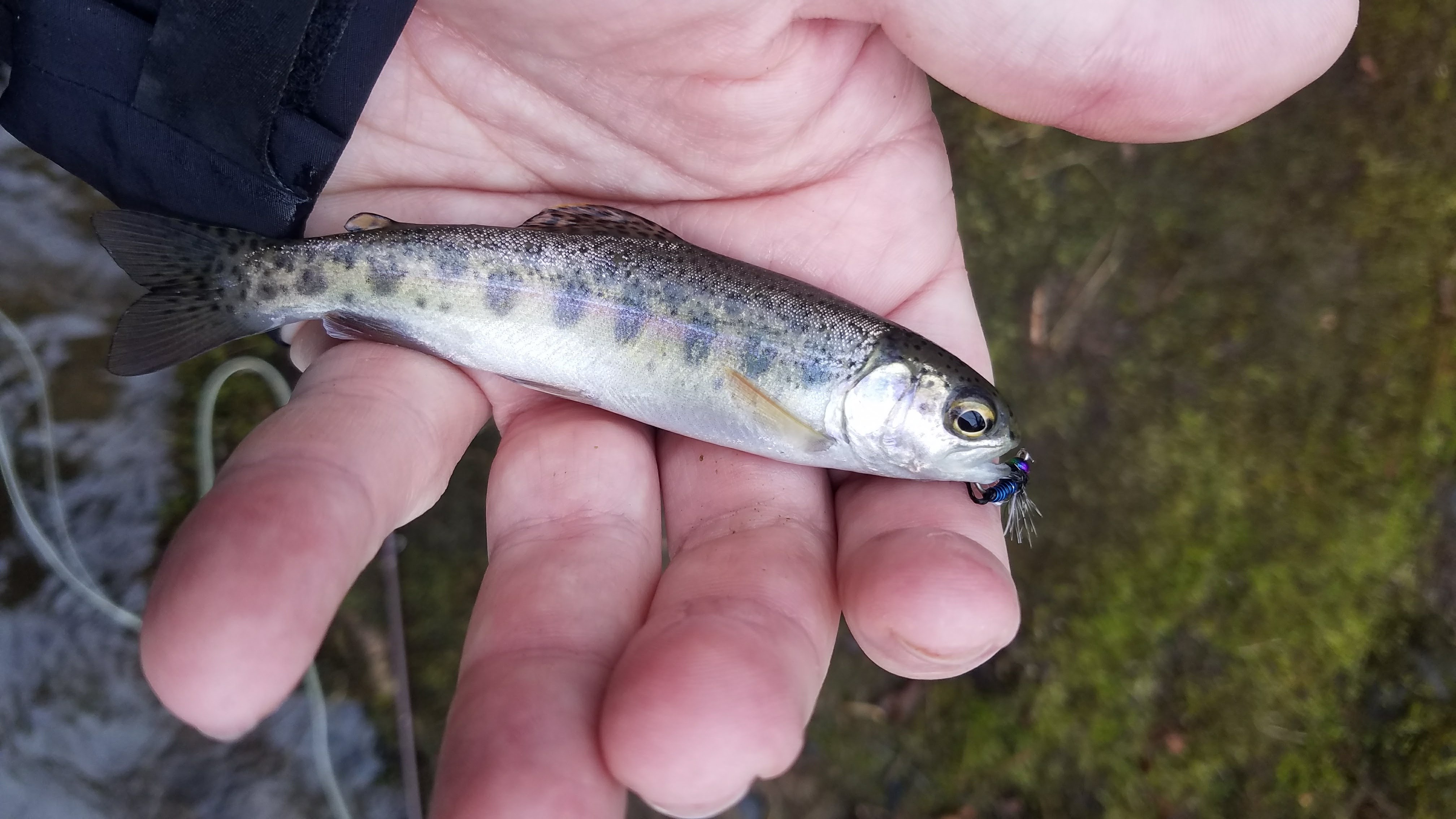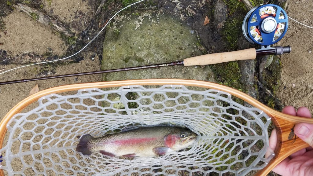 The pool is behind a low head dam that diverts the water to the hatchery thru a pipeline. I didn’t see any fish on the near side of the bank, but I cast out across towards the intake where the water was a bit deeper and faster, and I’ll be damned if the first cast I got a fish on.