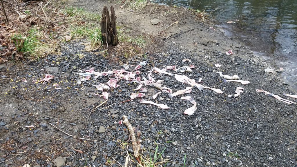 Around 11:00 I made my way back to the game check station for lunch that was provided by the Appalachian chapter of Trout Unlimited. The fare was great for a drizzly day, consisting of hot dogs, and “bambi chilli”, along with chips and some various soda. As everyone filed in to eat, the trophies of trash people found were placed along the parking lot to claim the prize of the weirdest item found. We could have built a full car with all the parts found, including a steering column/wheel, front clips, cv joint, and headlights. Plenty of old pull tab cans, a mattress spring frame, and one condom were also found. The weirdest thing I found was a fidget spinner, which did not join the pile.